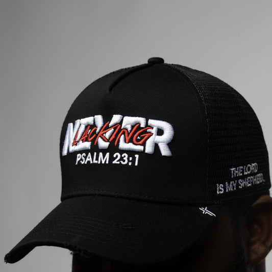 "NEVER LACKING" Trucker Hat | Distressed Black