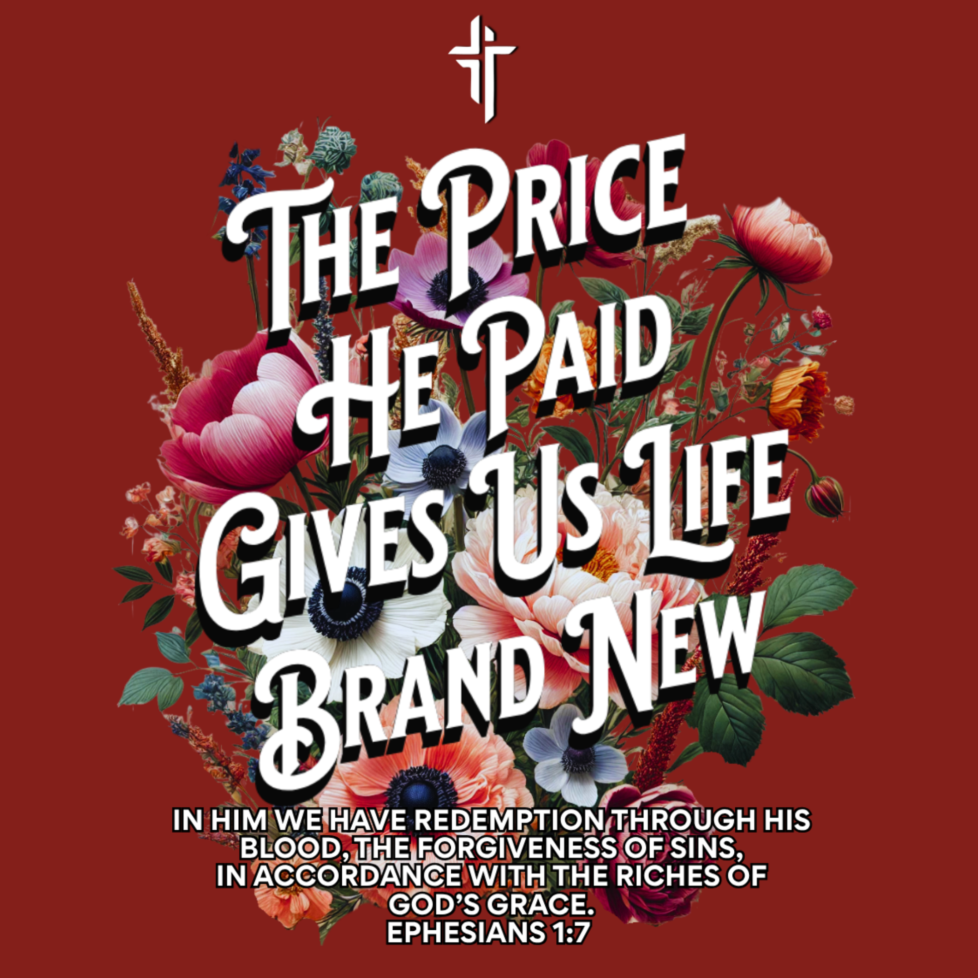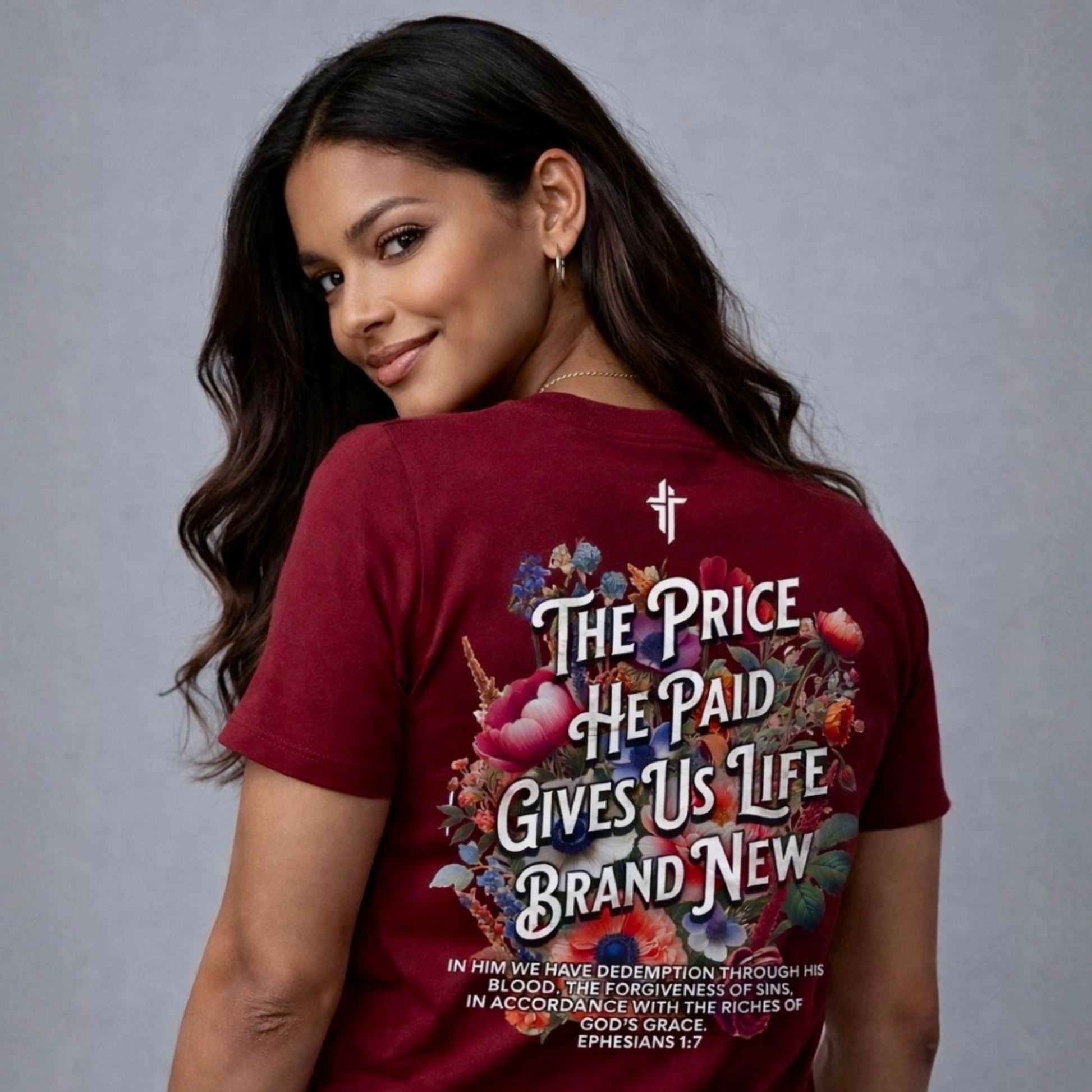 Featuring the statement “The price He paid gives us life brand new,” this tee pairs a striking floral design with a powerful message rooted in Ephesians 1:7 | that through His sacrifice, we are redeemed and made new.